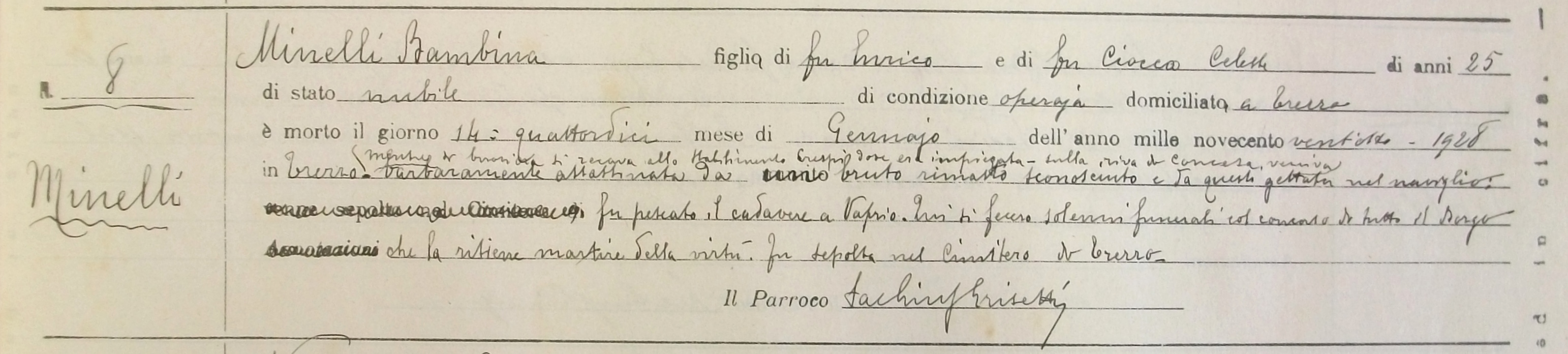 A Trezzo, vengono raccolti sulla riva del Santuario carmelitano di Concesa gli zoccoli, le sue trecce recise e l’involto del pranzo. Benché l’ipotesi più plausibile è che la donna sia scivolata in acqua per sfuggire a un bruto, il caso viene archiviato come suicidio poco ortodosso.