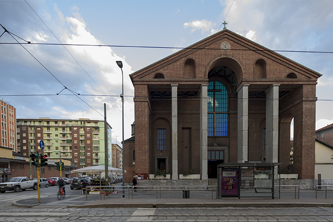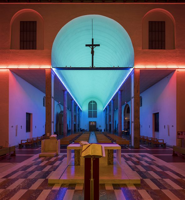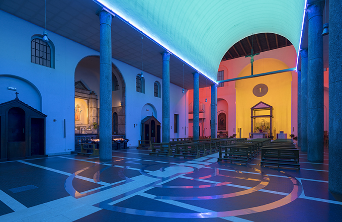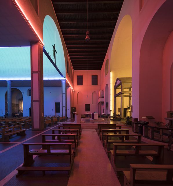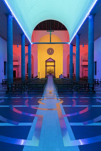 Chiesa parrocchiale dei Santi Cosma e DamianoIn S. Maria Annunciata in Chiesa Rossa, l’austerità di Muzio incontra la luce di Flavin: tubi di colore trasformano lo spazio sacro in un viaggio immersivo, dove architettura e arte si fondono in un’esperienza contemplativa unica.