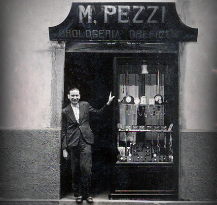 L’affascinante storia di questa attività ha inizio sul finire del XIX secolo, quando Anselmo Pezzi, bisnonno di Giuseppe, dopo aver appreso l’arte orologiera a Treviglio, decise di aprire la sua attività nel paese natale. Sebbene il primo documento ufficiale che attesta l’avvio dell’esercizio risalga al 1902, è probabile che Anselmo avesse già operato come riparatore qualche anno prima, senza una formalizzazione scritta. A riprova di questo, il figlio Mario, nato nel 1900, vide la luce proprio in quella che sarebbe diventata la “sede operativa” della famiglia. Un legame indissolubile con il luogo che si è mantenuto: da quando l’attività è iniziata nell’odierna via Matteotti, tutte le generazioni Pezzi hanno abitato negli appartamenti soprastanti il punto vendita, consolidandone la funzione abitativa e commerciale, soprattutto dopo averne acquisito la proprietà negli anni Trenta.