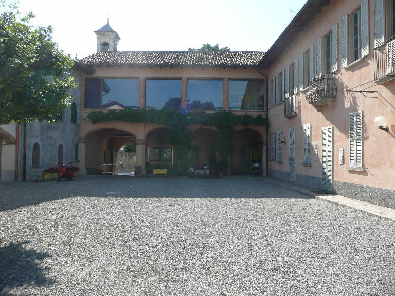Verso la corte interna, al piano terra si apre un portico a quattro archi ribassati sorretti da pilastri a base poligonale e, sopra di esso, un loggiato con colonnine in laterizio, oggi chiuso da vetri trasparenti, completato durante i restauri più recenti. Il braccio perpendicolare, probabilmente costruito nel corso dell’Ottocento, si presenta con facciate intonacate ma prive di cornici decorative; vi si alternano finestre e porte-finestre con balconcini in ferro battuto, che affacciano sulla corte. Al di là della corte si apre un giardino, oggi fruibile al pubblico, attraversato da un vialetto disassato che corre tra un muretto e i vecchi muri di cinta. Al suo centro, come un ricordo che non svanisce, si conserva ancora un pozzo ottocentesco.