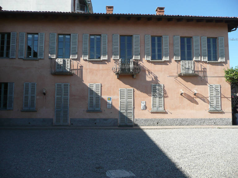 La facciata principale, rivolta su via Manzoni, conserva un’eleganza rococò/neorococò: intonaci chiari, cornici mistilinee alle finestre del piano terra, due porte-finestre finemente lavorate e, al piano superiore, una porta-finestra centrale con balconcino in ferro battuto, elemento che conferisce ordine e garbato equilibrio. Una cornice marcapiano separa visivamente i due livelli, mentre l’accesso all’interno è garantito da un androne porticato laterale, incastonato tra corpi di fabbrica successivi.
